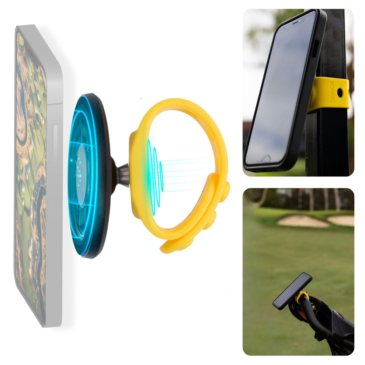 CRVNCH is purpose-built for golfers. Designed in Australia, it combines industrial-grade magnetic strength, automatic one-touch locking, and aerospace-grade materials to ensure your phone stays secure even on the roughest terrains. It’s a premium, golf-specific solution — not a generic mount.